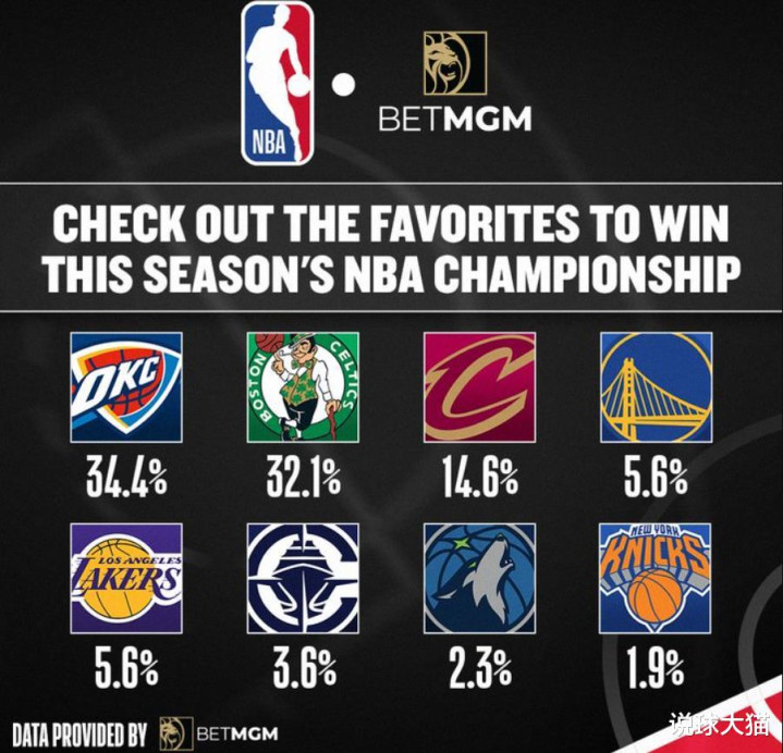 与此同时,美媒体也给出了本赛季NBA最新夺冠概率。其中,上榜的球队仅有8支且火箭、掘金、灰熊和魔术,目前于媒体看来均处于绝对的弱势。